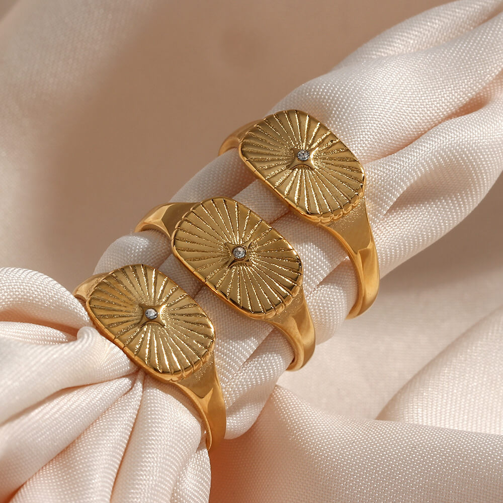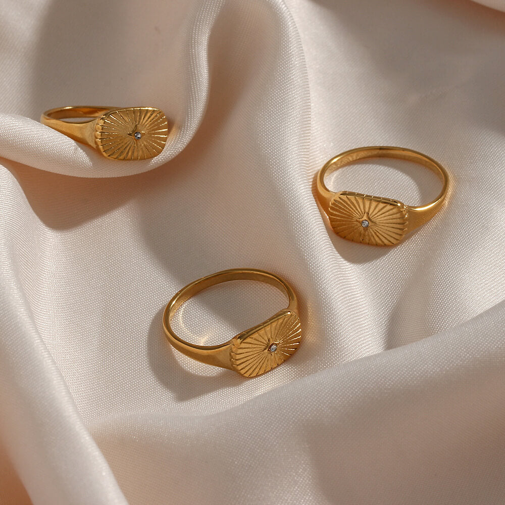 Elevate your style with this Zircon Sun Signet Ring, featuring a radiant sunburst design with a delicate central accent. Its timeless charm and sleek silhouette make it a stunning statement piece.